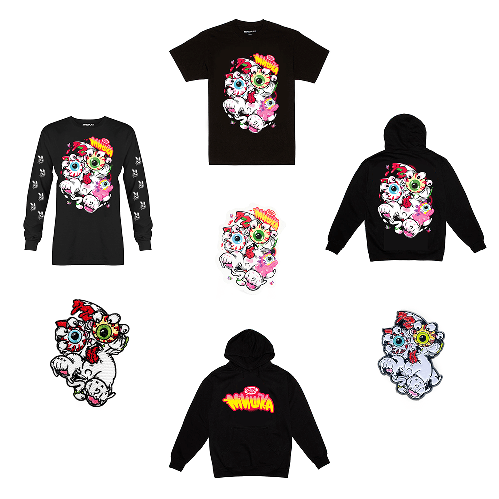 This collection features his character Onigiri using the MISHKA “keep watch eyes” for the eyes. Look for the art to be featured on signature Mishka Hoodies, T-shirts, and long-sleeves. The collection also features a limited edition patch, pin, and stickers.