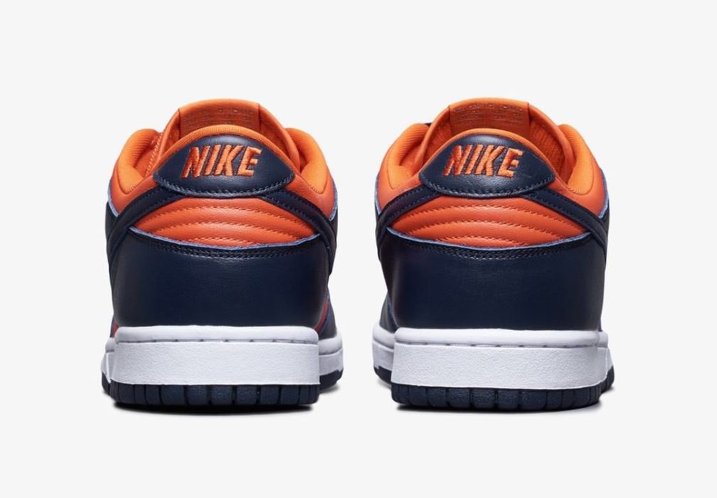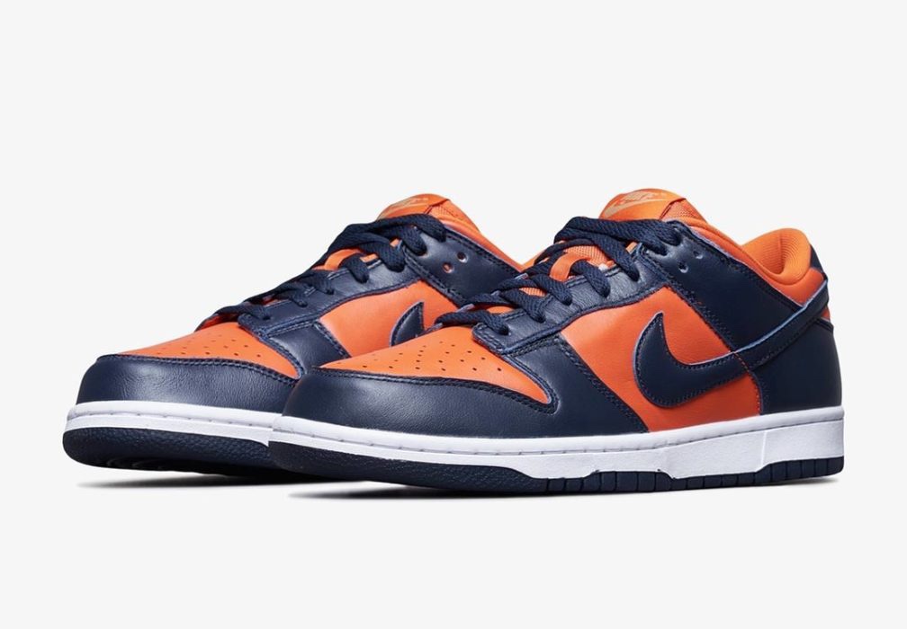 The Nike Dunk Low SP “Champ Colors” has a color palette of navy and orange overlays on the upper with navy on the heel cap, lace locks, and toe counter while the the tongue, side panels and toe box see orange. The white midsole offsets the dark tone of the navy Swoosh and misc. Nike branding.