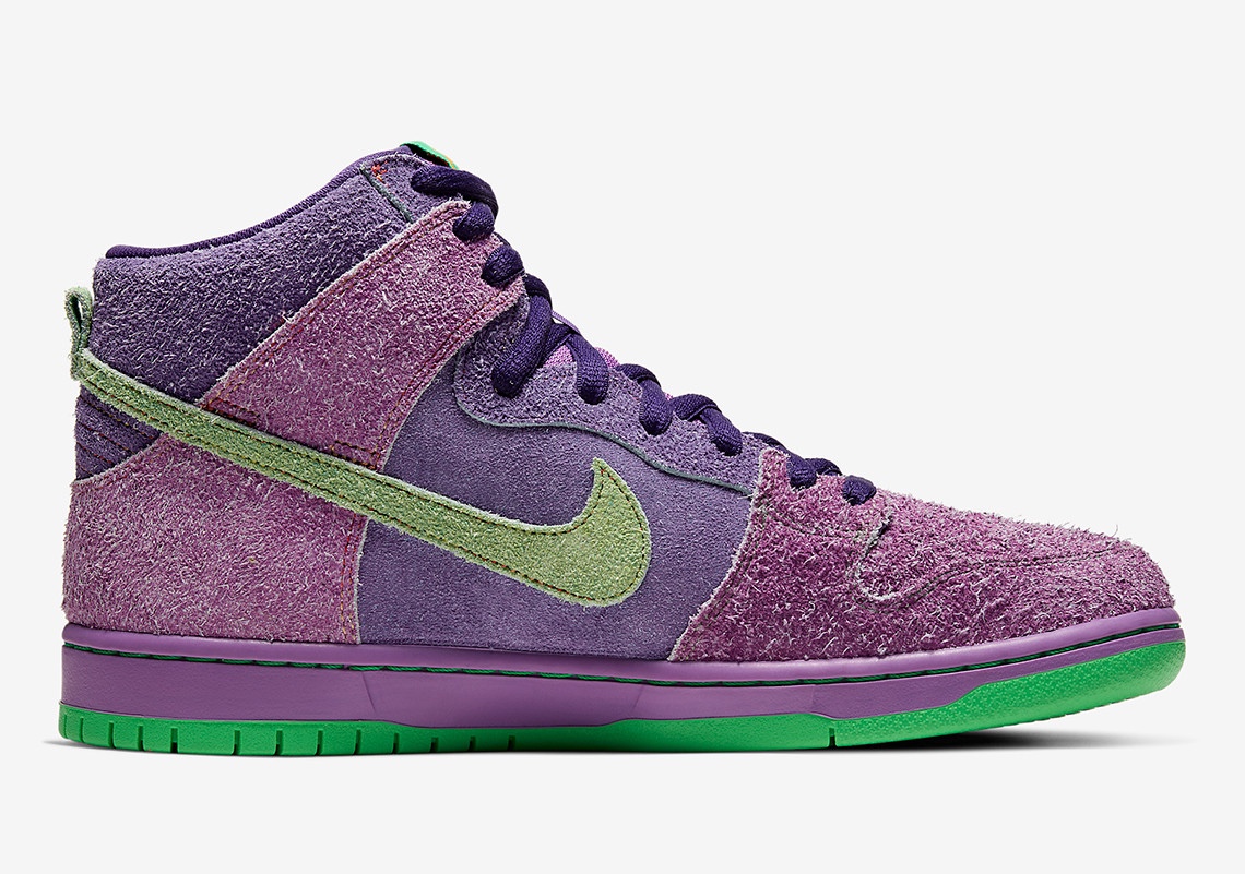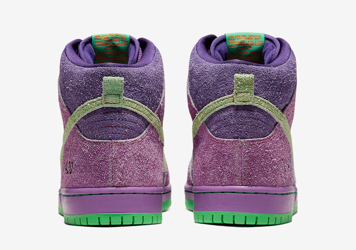 This sneaker is equipped with an array of suede materials that are very similar to its predecessor being that the only difference is the color reversals. There are different hues of purple seen throughout the silhouette with the Swooshes having an olive or cannabis color. A Skunk graphic is seen on the insole and there is a special stash pocket on the inside tongue as well.
