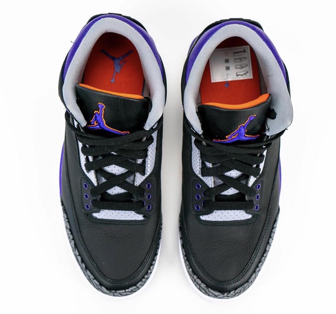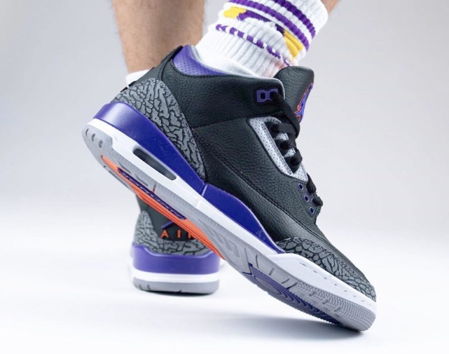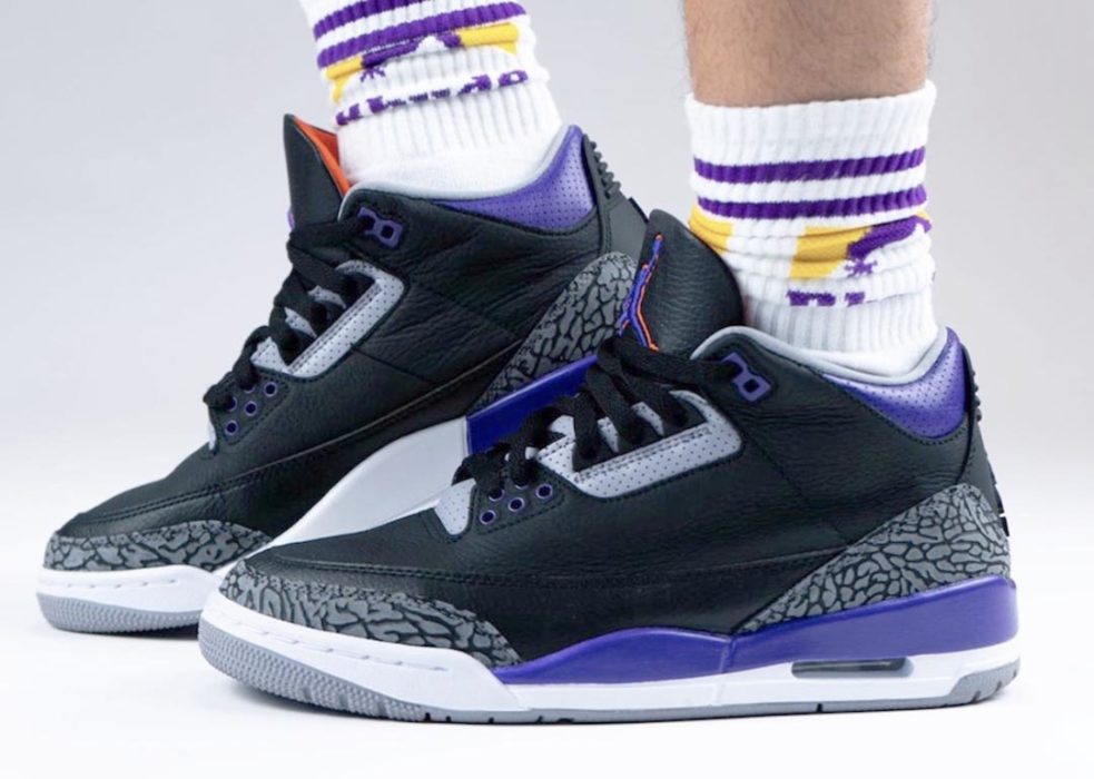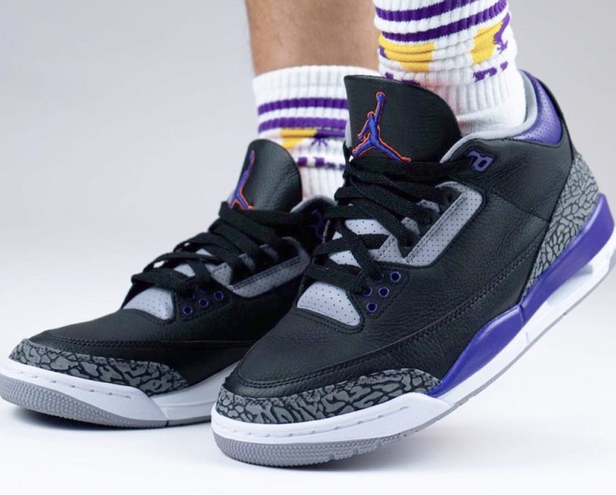 A Lakers inspired Air Jordan 3 colorway could be on the way just in time for the holidays. Named “Court Purple,” this Los Angeles Lakers rendition comes in a black/purple/white colorway with a mostly matte black upper with purple hits on the back heel, midsole and Jordan logo.