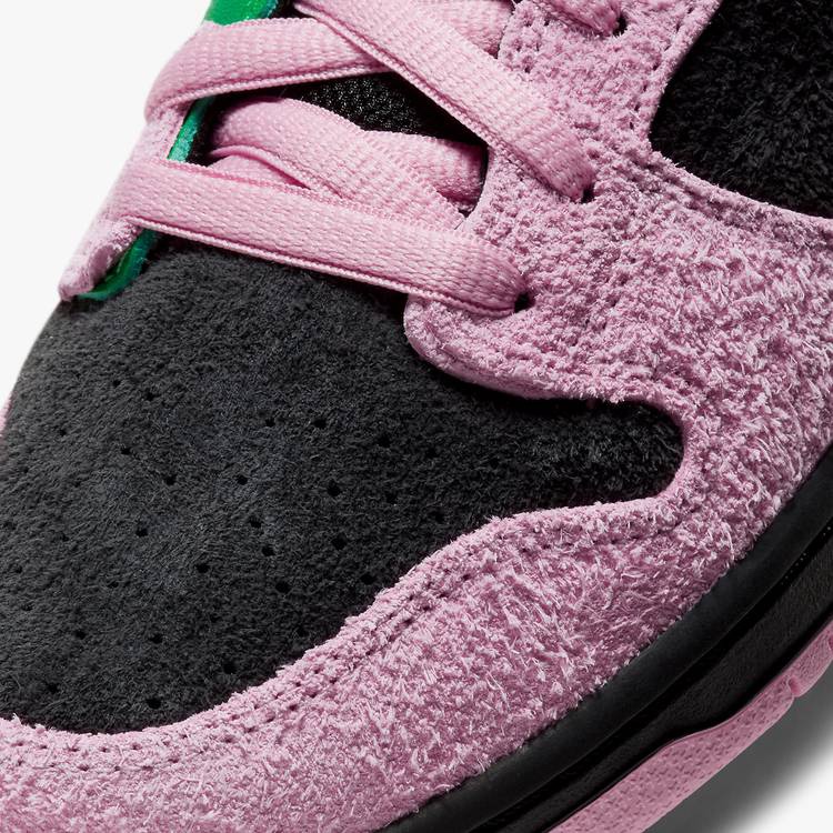 These “Invert Celtics” feature a mixture of shaggy pinky/black suede on the upper combined with a medial quarter of green/white leather. Pink hits can also be seen on the eyelets, mudguards, heel, collar and Swooshes.