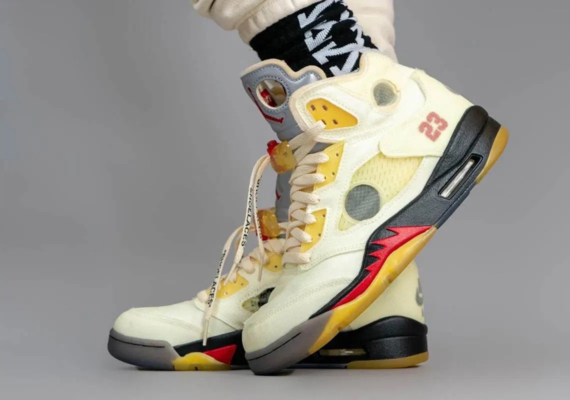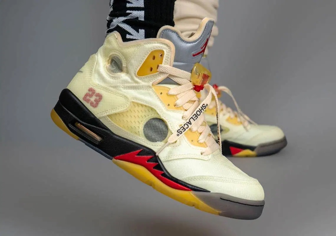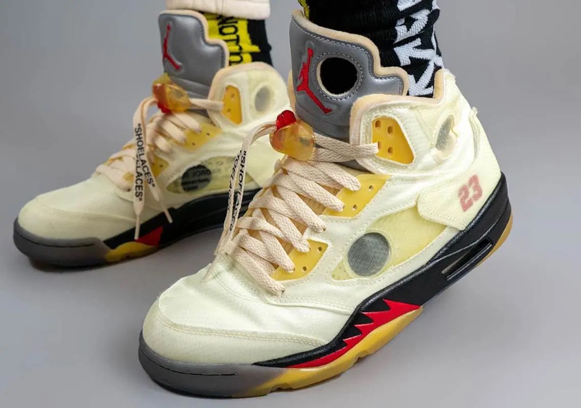 Off-White continues its collaboration with Jordan/Nike and the release date for the upcoming Air Jordan 5 “Fire Red” collab will be dropping toward the end of the month.